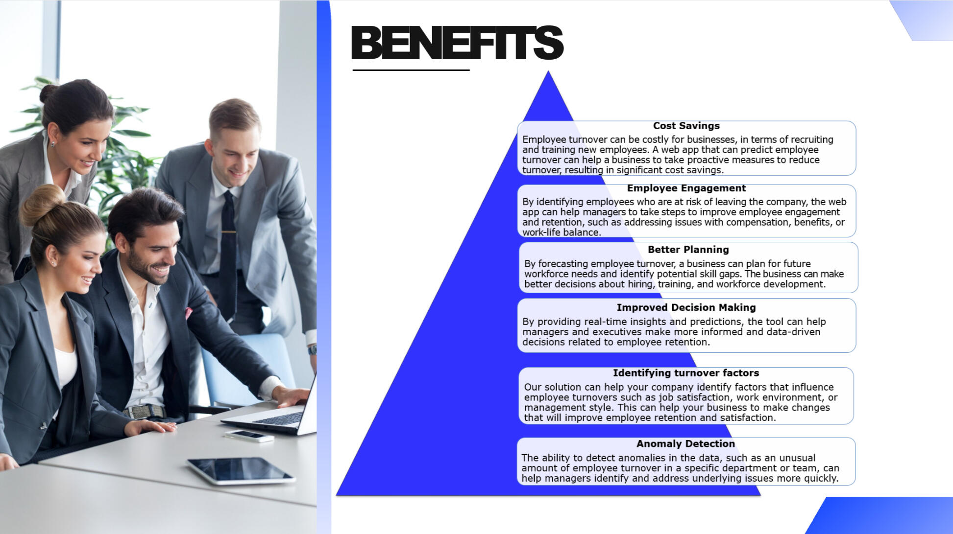 By leveraging our employee attrition prevention system, organizations can reduce turnover rates, minimize recruitment costs, and optimize their workforce for increased productivity and efficiency.